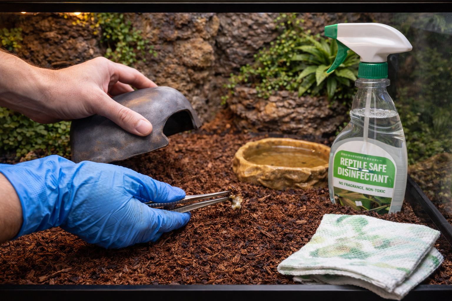 Use reptile-safe cleaners or hot water—never harsh household chemicals.