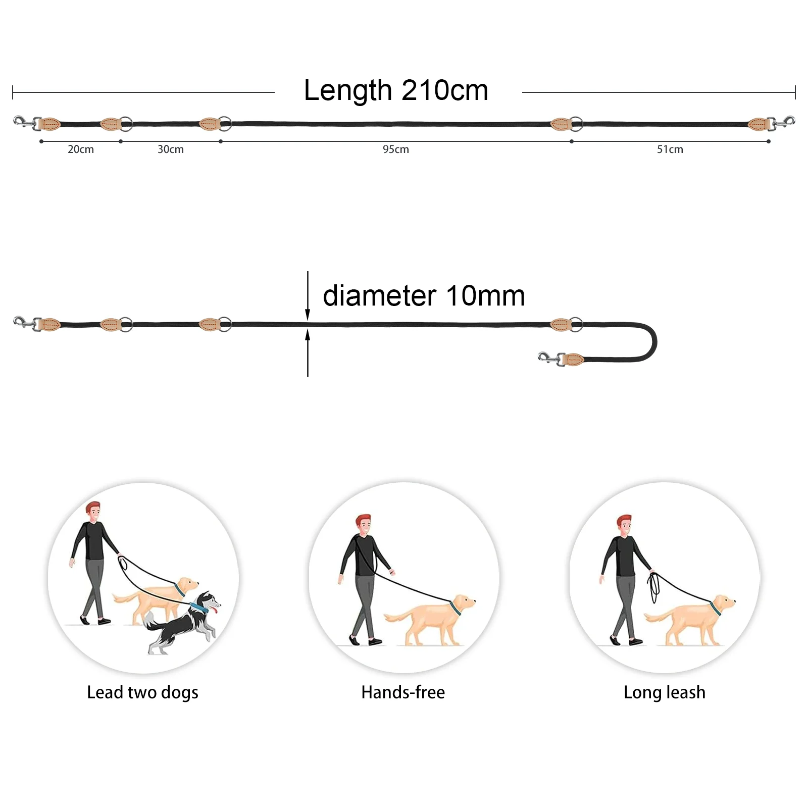 It is quite resistant for large dogs. Thick lace made that helps to catch the hands without scratches, or pass it over the shoulder to keep hands free of movement. It is shortened or extended through regular sections in different positions.