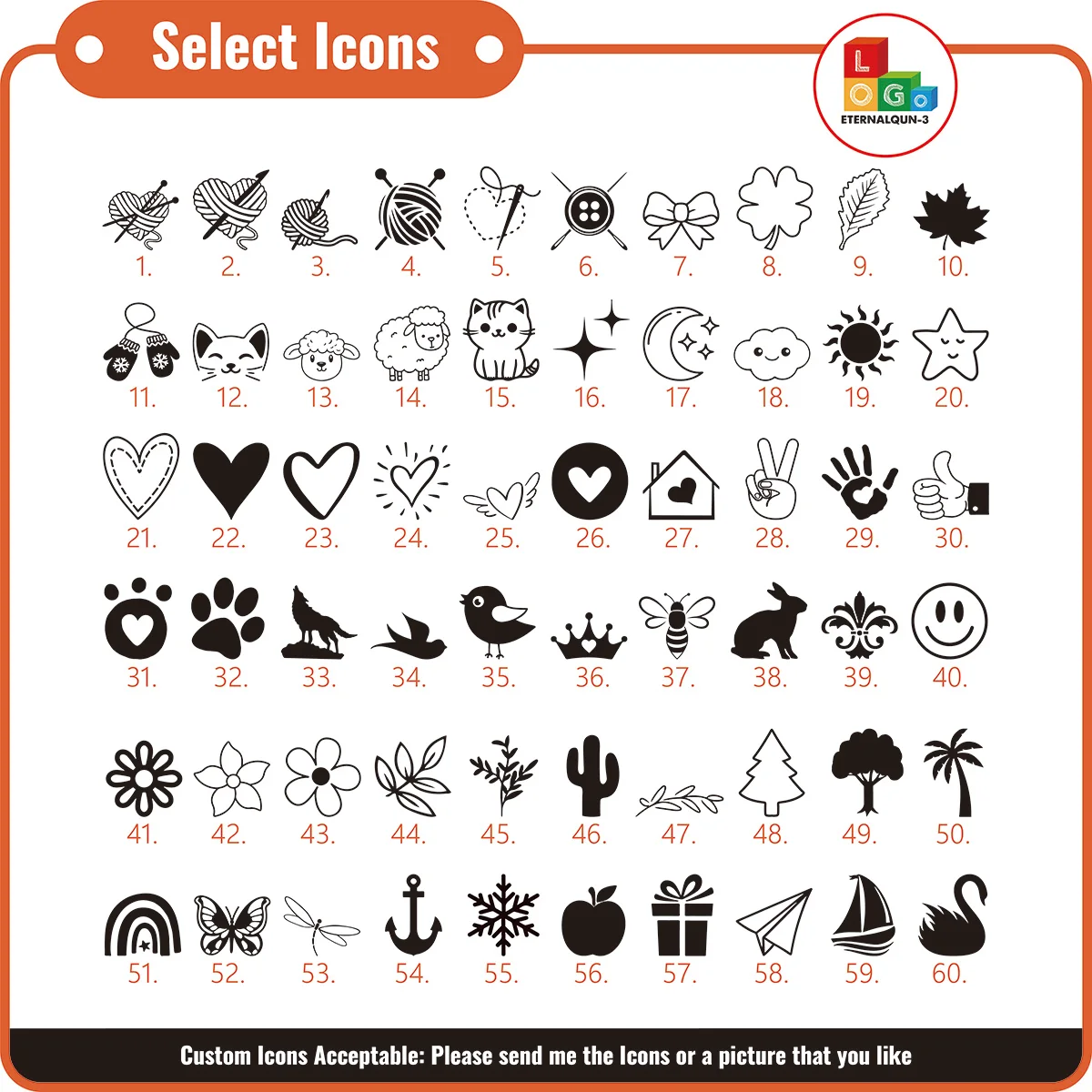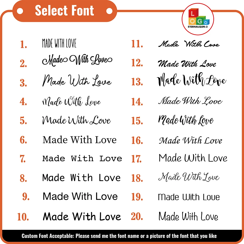 Please send your text and select the font (you’ll find the examples of fonts and symbols in one of the listing’s images ). Or you can send your logo in the chat.