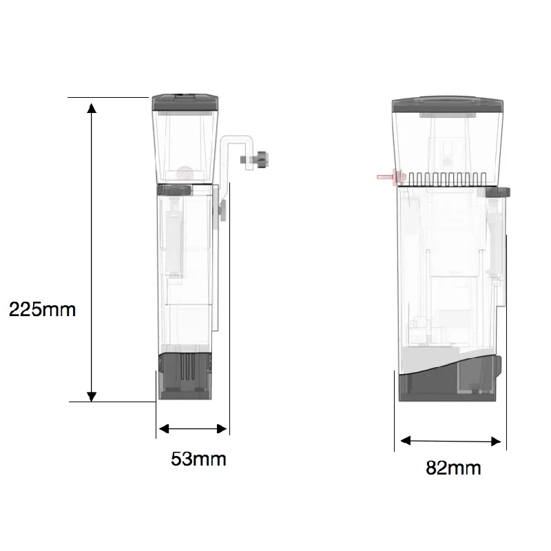 It is the latest product developed by BUBBLE-MAGUS, especially for the exquisite small marine fish tank design. The length and width are only 82*83mm. The slim shape is very suitable for placing in the back filter grid of the fish tank. Professional configurations such as water level regulating valve and muffler are all available.