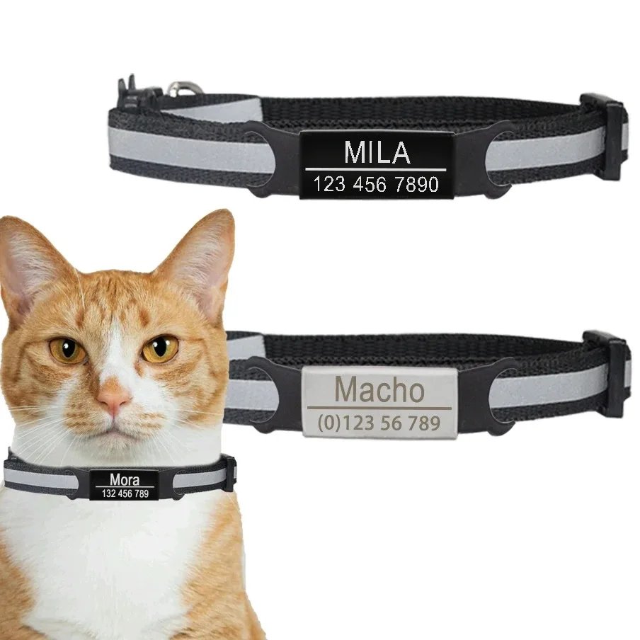 Personalized Name Reflective Cat Collar -Custom ID Adjustable Safety Buckle with Bell Free Engraving Nylon Material Pet Necklace