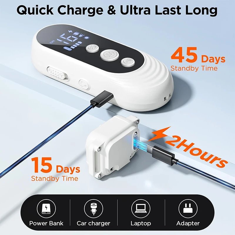 Rechargeable & Long Battery Life: Our electronic collar adopts built-in lithium battery for charging, you can use power adapter, mobile power or laptop to charge the shock collar, which is very convenient. In addition, it only takes 2 hours to be fully charged. But when you charge it for the first time, please be sure to charge it for 4 hours. The battery life is long, the standby time of the electronic collar is up to 15 days, and the standby time of the remote control is up to 45 days!