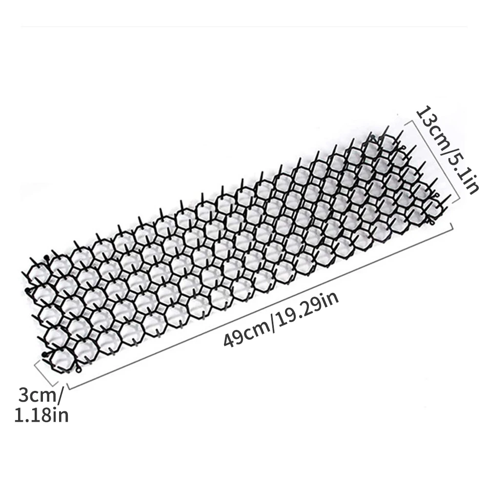 Each package contains 6 barbed strips + 12 garden stakes + 30 cable ties/10 barbed strips + 12 garden stakes + 30 cable ties. The interlocking system design can easily cover a larger area. Prickly strip size: 49 x 14 x 2.7cm.