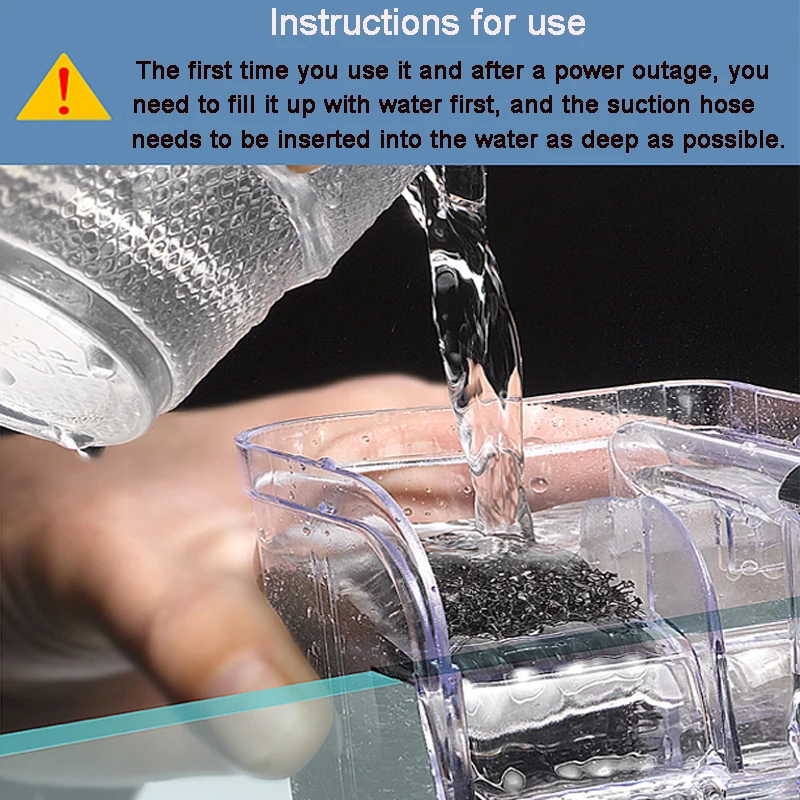 !!! Before connecting the power, please ensure that the filter box is filled with water and that the water level in the fish tank is above the position of the water pump motor!!!